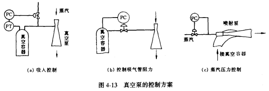 (3)對蒸汽噴射式真空泵,在泵的一定設計條件下,只要保證一定的蒸汽壓力,就能達到一定的真空度。因而一些企業只使用一個蒸汽壓力控制系統,如圖4—13(c),就可以取得滿意的效果。
